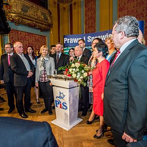 Były premier zapewnił również, że jeśli Prawo i Sprawiedliwość wygra wybory to od razu przystąpi do realizowania swoich wyborczych obietnic, m.in. 500 zł na każde dziecko. Podczas krótkiego spotkania udzielił także poparcia kandydatom na posłów i senatorów, ale nie wszystkim. Pominął jedynie Łukasza Zbonikowskiego, posła startującego z listy nr 1, ale wykluczonego z partii, obecnego na sali ( w pierwszym rzędzie).
