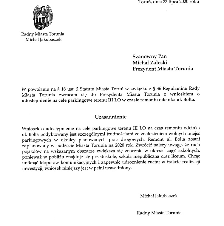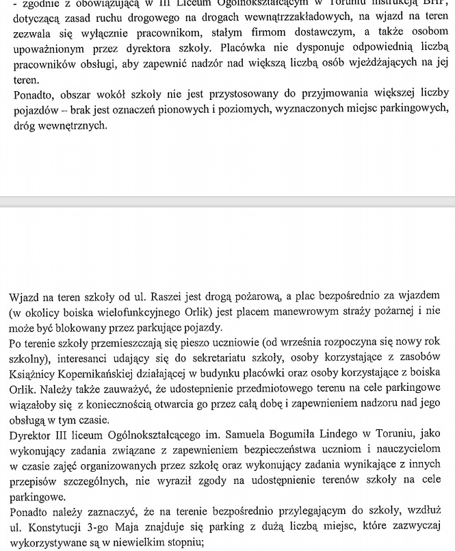 Radny Michał Jakubaszek zwrócił się z wnioskiem do prezydenta Torunia o udostępnienie terenu III LO przy ul. Raszei na cele parkingowe w momencie prowadzenia prac remontowych przy pobliskiej ul. Bolta. Urzędnicy wraz z dyrektorem placówki mówią jednak stanowcze "NIE".