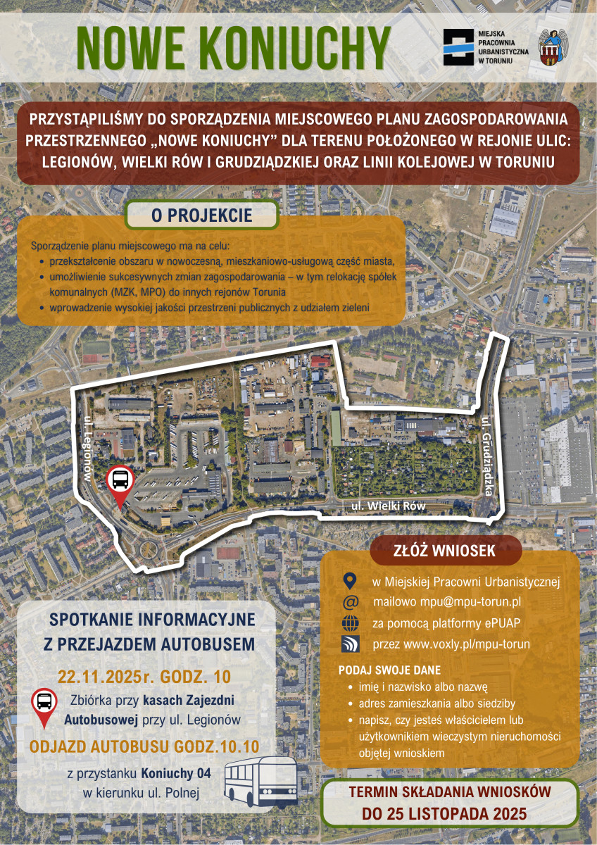 16 października Rada Miasta Torunia przyjęła uchwałę rozpoczynającą przygotowanie miejscowego planu zagospodarowania przestrzennego „Nowe Koniuchy”. Dokument obejmuje tereny położone w rejonie ulic Legionów, Wielki Rów i Grudziądzkiej oraz linii kolejowej.