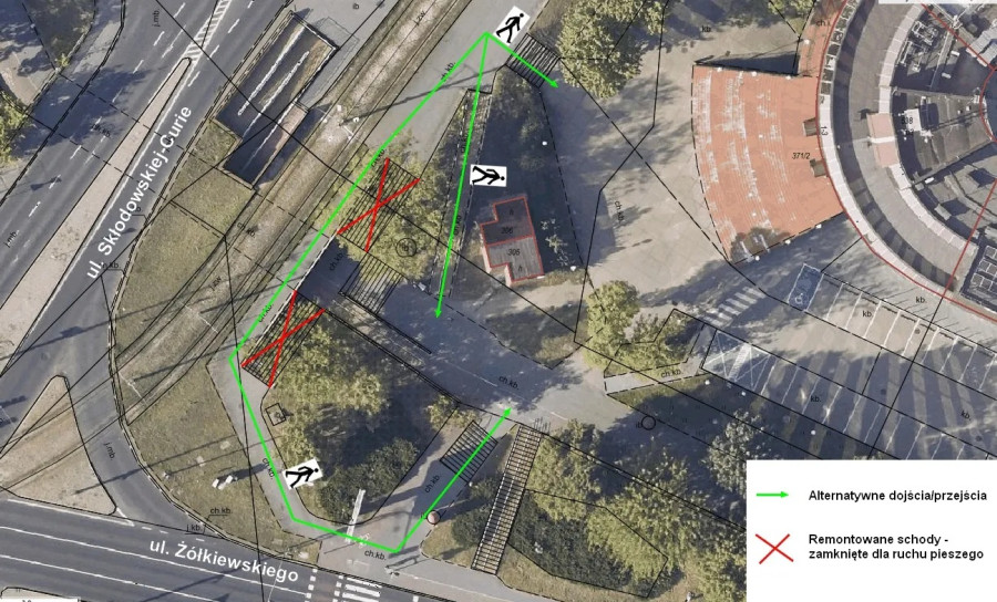 - Do dyspozycji pieszych zostają pozostałe ciągi komunikacyjne w obrębie przejścia podziemnego tj. pochylnie i schody zlokalizowane bliżej przystanku autobusowego oraz przy skrzyżowaniu ul. Skłodowskiej-Curie z ul. Żółkiewskiego.