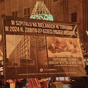 Drugi baner przedstawiał toruński szpital na Bielanach, obok którego umieszczono wizerunek dziecka urodzonego w 21. miesiącu ciąży oraz hasło informujące, że „w szpitalu na Bielanach w Toruniu w 2024 roku zabito 27 dzieci przez aborcję”.