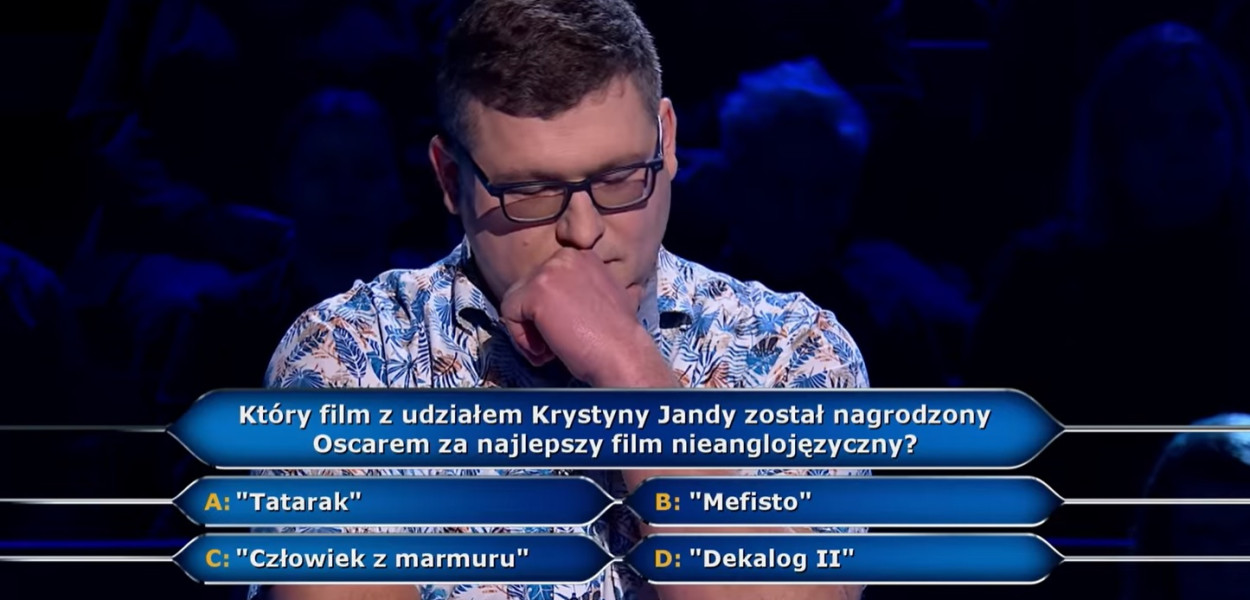 Torunianin gładko przeszedł przez kilka pytań. Do momentu gdy do wygrania było 10 tysięcy złotych nie skorzystał z żadnego koła ratunkowego. Wtedy pojawiła się zagadka dotycząca filmu, a konkretnie tego, który film z udziałem Krystyny Jandy został nagrodzony Oscarem za najlepszy film nieanglojęzyczny.