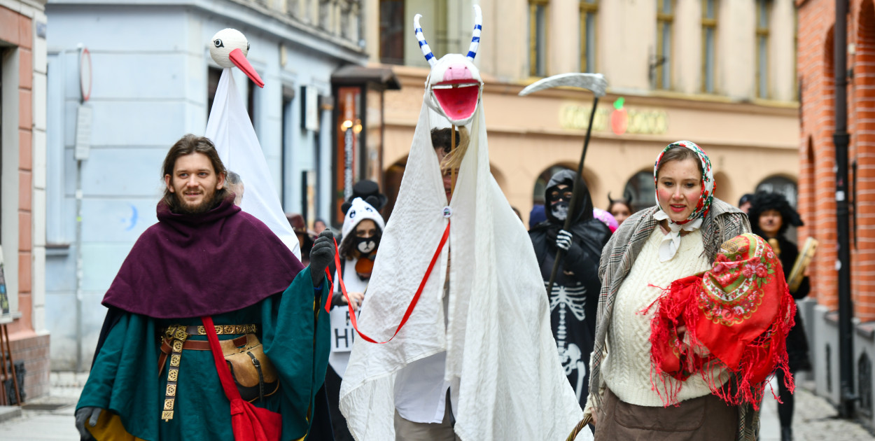 Barwny korowód przebierańców przeszedł ulicami toruńskiej starówki, prezentując tradycyjny kujawski obrzęd chodzenia z kozą.