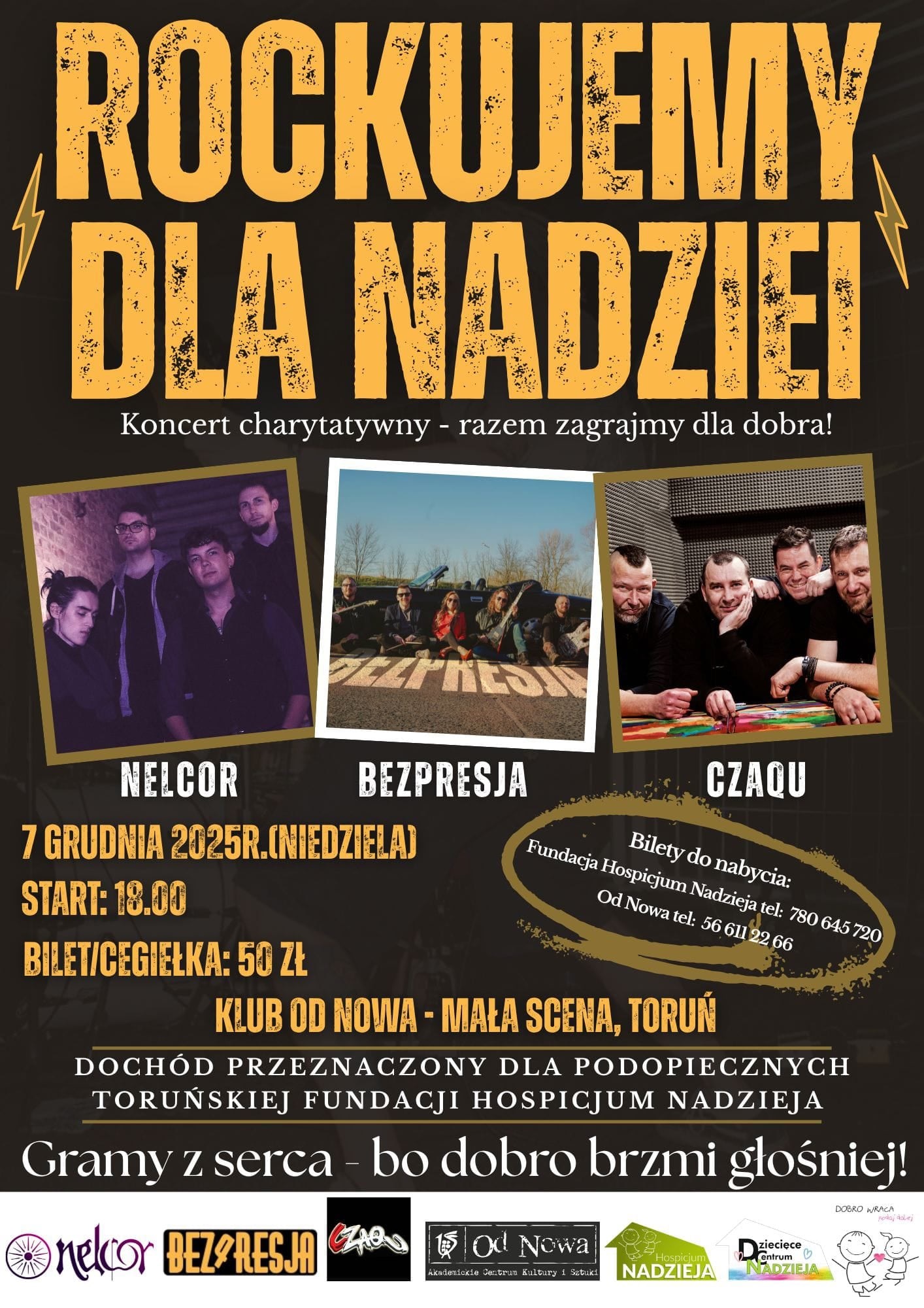 Rockowe brzmienia i realna pomoc tym, którzy potrzebują jej najbardziej. W najbliższą niedzielę, 7 grudnia o godzinie 18:00, scena klubu Od Nowa w Toruniu zamieni się w przestrzeń muzyki, wsparcia i solidarności. Podczas koncertu charytatywnego „Rockujemy dla Nadziei” artyści wystąpią dla podopiecznych Fundacji Hospicjum Nadzieja, a cały dochód z wydarzenia zostanie przekazany na cele pomocowe.