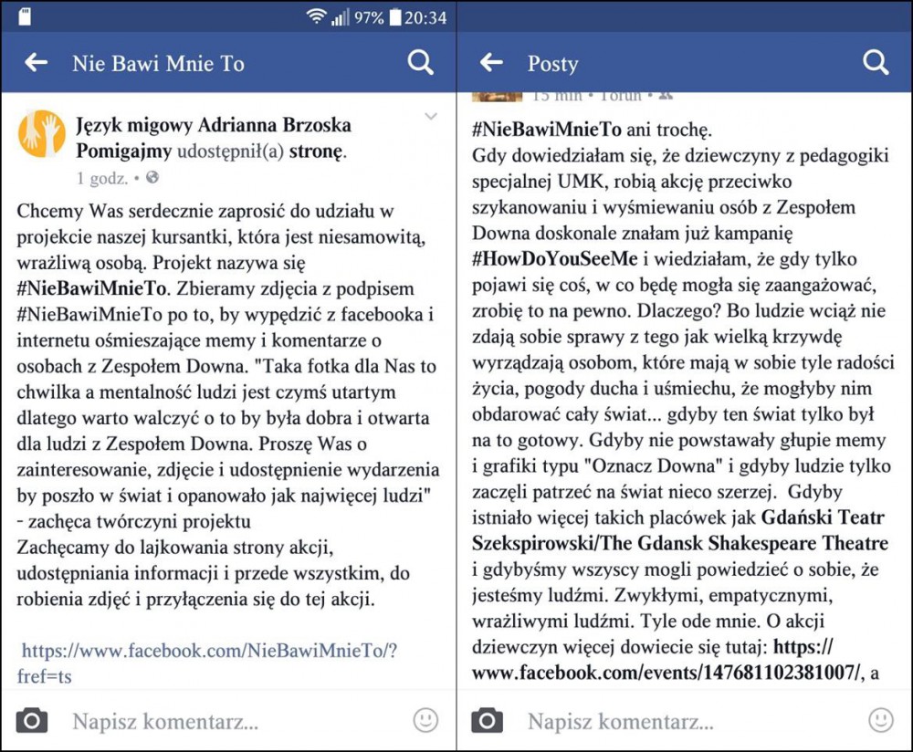 Sandra Melkowska, Sonia Kłosińska, Weronika Dopierała, Aneta Czarnecka, Martyna Kopkowska i Milena Borkowska utworzyły więc wydarzenie na Facebooku NieBawiMnieTo. Każdy może przysłać im własne zdjęcie z trzymanym napisem #NieBawiMnieTo. Akcja ma pokazać, jak wiele jest osób integrujących się z osobami z Zespołem Downa.