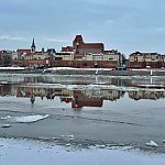 Z lewobrzeża doskonale widać także panoramę Torunia – starówkę przykrytą śniegiem, most i charakterystyczną linię miasta odbijającą się w zimowym pejzażu Wisły. To jeden z tych dni, gdy mróz szczypie w policzki, ale widoki w pełni to rekompensują.