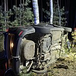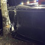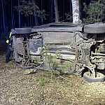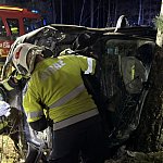 – Samochód osobowy uderzył w drzewo i leży na boku, 4 osoby poszkodowane w tym 2 zakleszczone