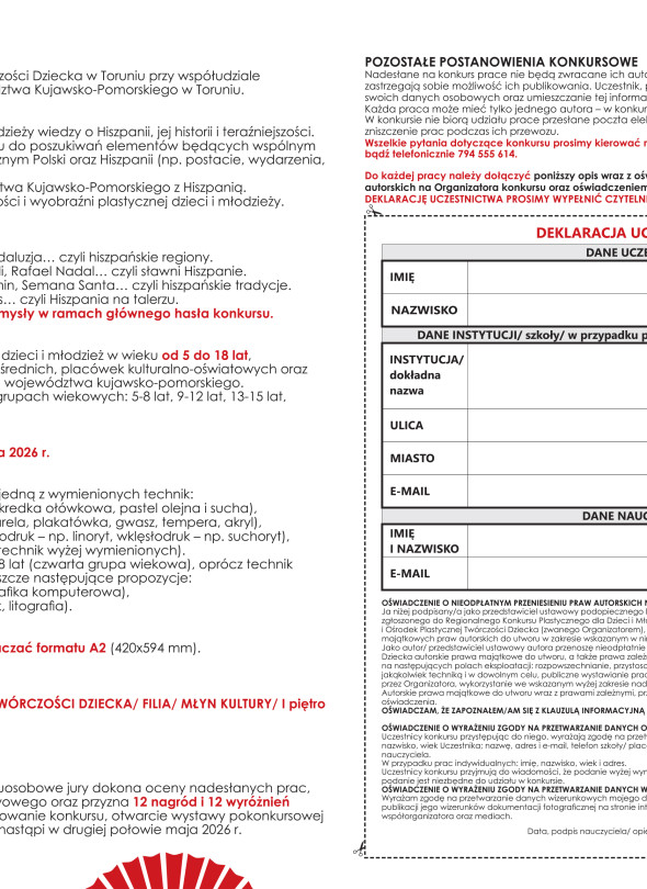 Galeria i Ośrodek Plastycznej Twórczości Dziecka w Toruniu przy współudziale Urzędu Marszałkowskiego Województwa Kujawsko-Pomorskiego w Toruniu organizuje REGIONALNY KONKURS PLASTYCZNY dla dzieci młodzieży !HOLA, ESPANA!