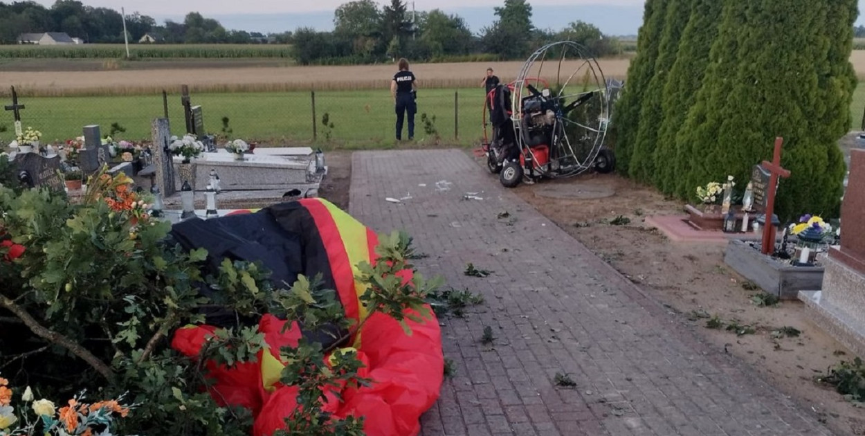 Dramatyczne sceny rozegrały się około godziny 19:33. Mężczyzna wystartował z otwartego terenu w pobliżu cmentarza i – według relacji świadków – zatoczył kilka kółek nad jego obszarem. Nagle paralotnia zaczęła tracić wysokość. 64-latek zahaczył o drzewo, a następnie runął na cmentarną alejkę.