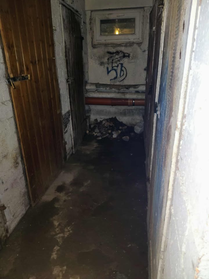 W piwnicy unosi się smród fekaliów. Pozostawiony jest kompletny syf. Gó**a leżą na stercie pod rurami, nikt tego nie sprząta od tygodnia. Na podłodze widać odchody i papier toaletowy. Zamiast to posprzątać, zostawili to samo sobie