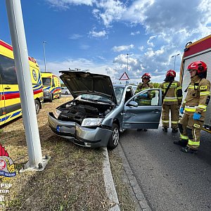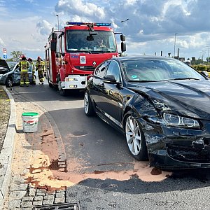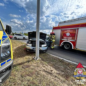 Zdjęcia udostępnione przez strażaków pokazują wyraźnie, że Skoda wjechała w słup. Drugim samochodem, który brał udział w zdarzeniu był Jaguar.