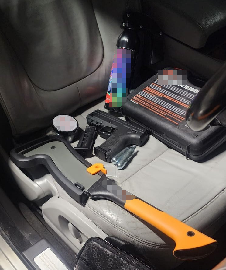 Podczas zatrzymania przy podejrzanych znaleziono niebezpieczne przedmioty m.in. petardy hukowe, maczety oraz przedmioty przypominające broń palną. Wszystkie zostały zabezpieczone przez policyjnych techników.