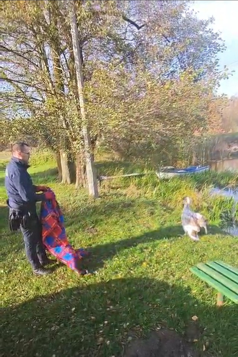 Na miejscu pojawił się patrol. Mundurowi szybko zorientowali się, że ptak nie odniósł obrażeń, ale był zestresowany i potrzebował pomocy. Funkcjonariusze skontaktowali się z pracownikiem Wdeckiego Parku Krajobrazowego, który telefonicznie przeprowadził ich przez procedurę postępowania z dzikim zwierzęciem. Dzięki tym wskazówkom udało się bezpiecznie schwytać ptaka przy użyciu koca.