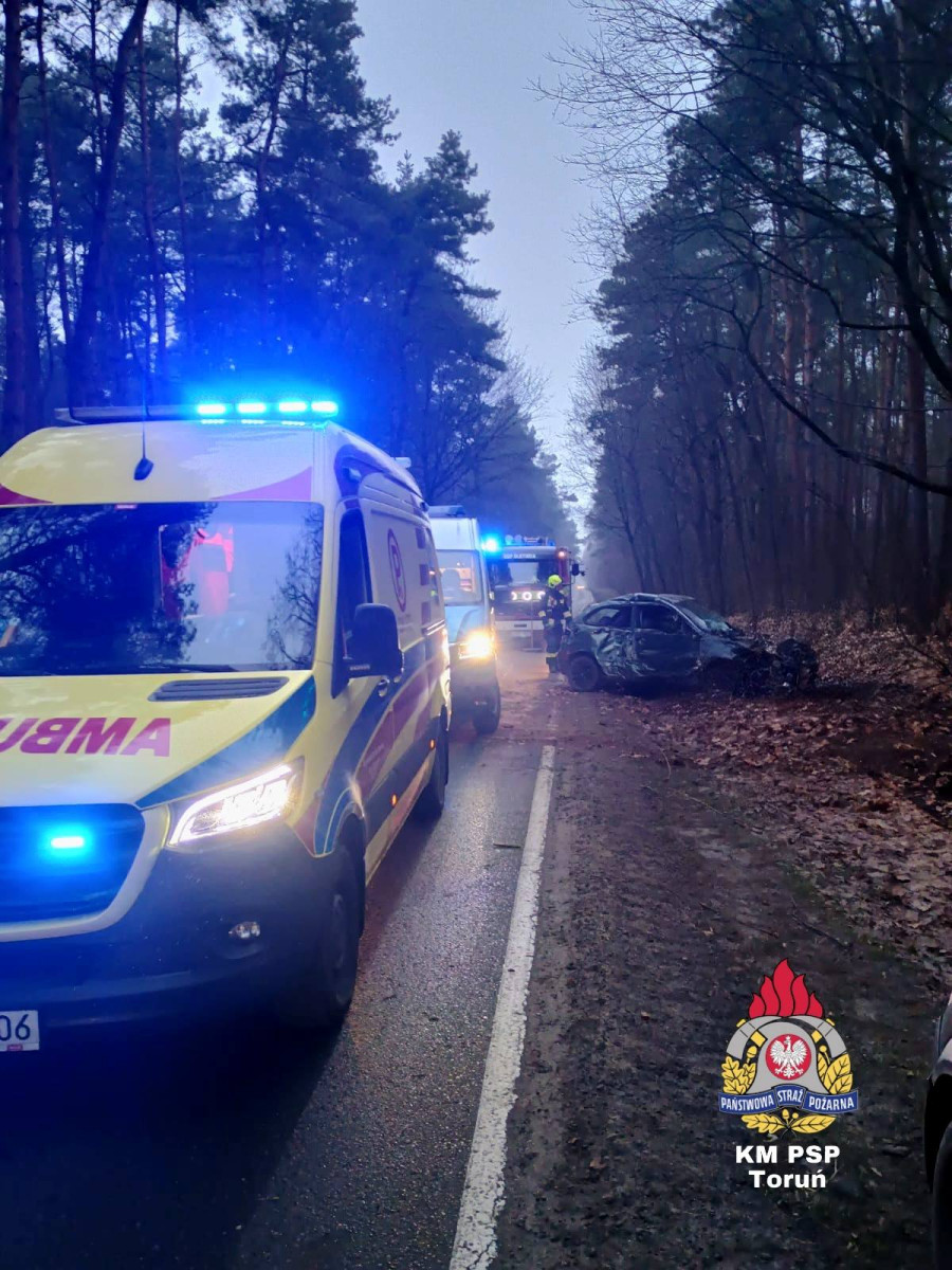 Pojazd wypadł z jezdni, co mogło mieć związek z bardzo trudnymi warunkami. Od popołudnia w regionie obowiązuje alert IMGW dotyczący gołoledzi i marznącej mżawki.