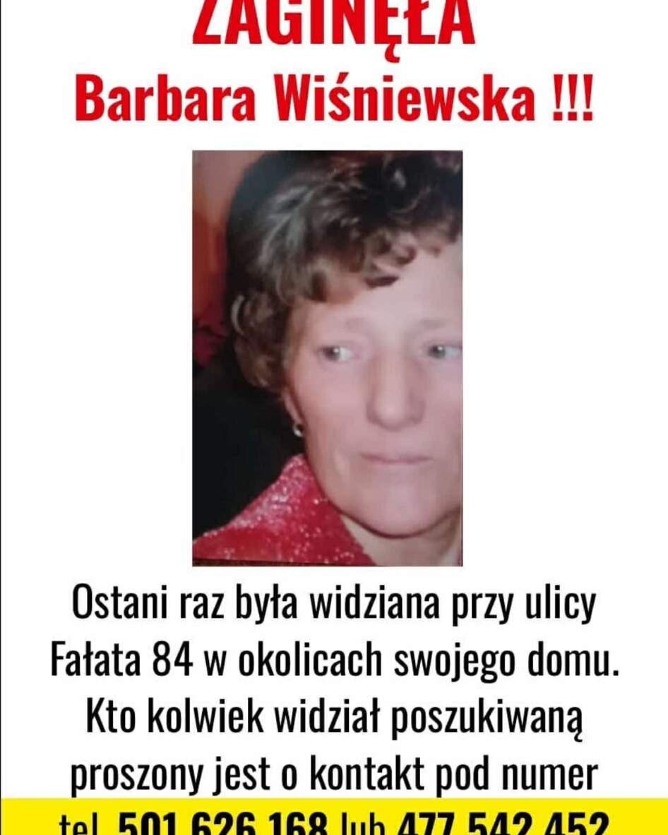 Osoby, które posiadają wiedzę mogącą pomóc w odnalezieniu Barbary Wiśniewskiej, proszone są o pilny kontakt pod numerami telefonu podanymi w ogłoszeniu: 501 626 168 lub 477 542 452.