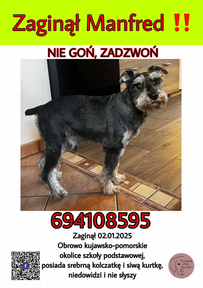 Osoby, które zauważą psa, proszone są o natychmiastowy kontakt telefoniczny pod numer 694 108 595. Każda informacja może być cenna i przyczynić się do szybkiego odnalezienia Manfreda.