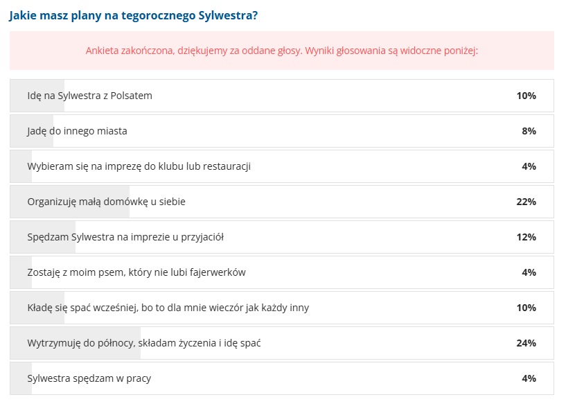 Wyjazdy również cieszą się popularnością – 8% pojedzie do innego miasta. Do klubów i restauracji wybiera się tylko 4% głosujących, tyle samo osób zostaje w domu z psem, który nie lubi fajerwerków. U przyjaciół sylwestra spędzi 12% ankietowanych, a 4% – spędzi go w pracy.