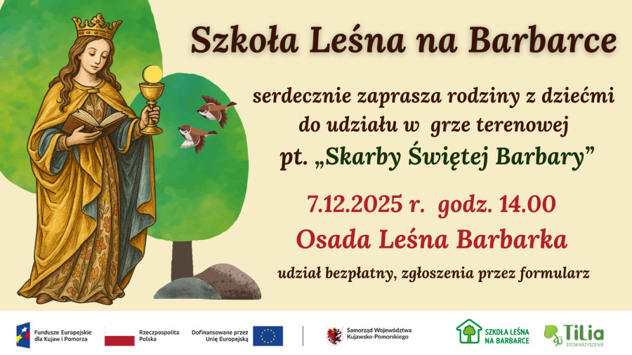 Wydarzenie organizowane jest w ramach projektu „Szkoła Leśna na Barbarce, wsparcie i rozwój działań Ośrodka Edukacji Przyrodniczo-Ekologicznej w regionie Kujawsko-Pomorskim”, realizowanego przez Stowarzyszenie Tilia przy wsparciu Funduszy Europejskich dla Kujaw i Pomorza 2021–2027.