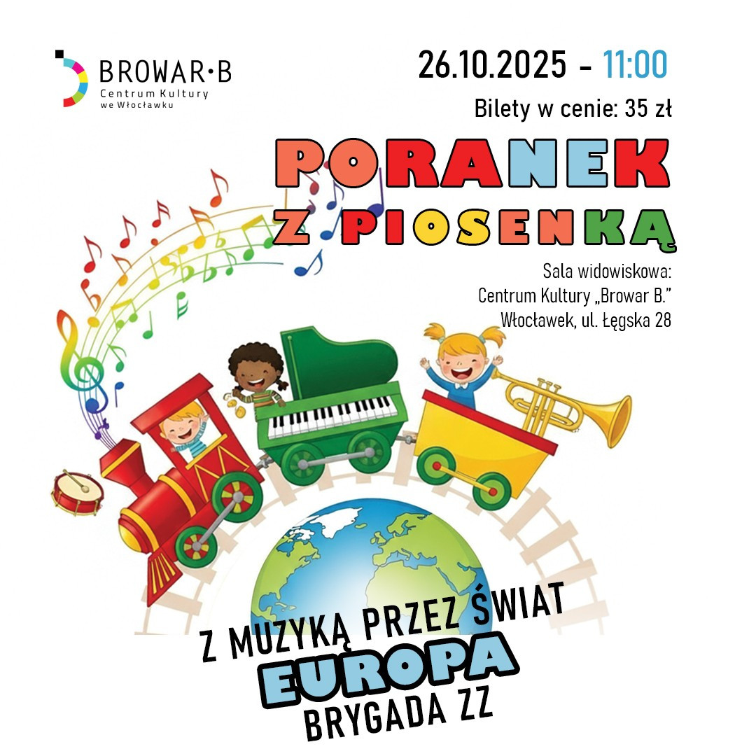 To będzie niedzielny poranek pełen dźwięków, kolorów i uśmiechów! Już 26 października o godzinie 11:00 sala widowiskowa Centrum Kultury „Browar B.” zaprosi najmłodszych włocławian i ich rodziców na wyjątkowe wydarzenie z cyklu „Poranek z piosenką” – interaktywny koncert „Brygada ZZ – z muzyką przez świat. Europa”.