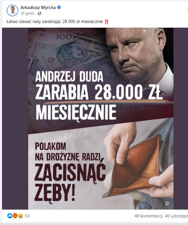 Poseł odniósł się do niedawnych słów prezydenta Andrzeja Dudy, który podczas swojego wystąpienia w Lipsku nad Wisłą (woj. mazowieckie) apelował do Polaków, aby w kwestii drożyzny i inflacji "zacisnęli zęby i byli optymistami".