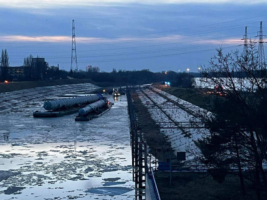 W sobotę do śluzy dotarły barki transportujące ogromne instalacje przeznaczone dla zakładu ORLEN w Płocku - kolumny do oczyszczania gazów, które przypłynęły do Polski z Chin.