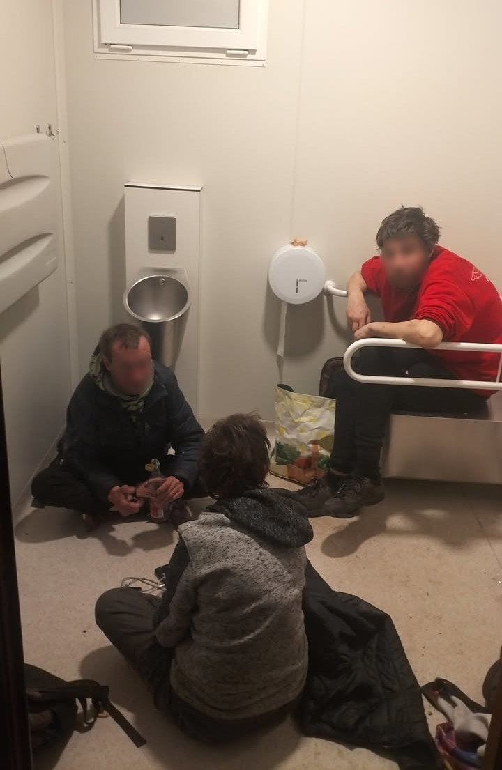 Na przesłanym zdjęciu widać trzech mężczyzn. Dwóch siedzi na podłodze, jeden zajął miejsce na toalecie. Obok znajdują się torby i butelki.