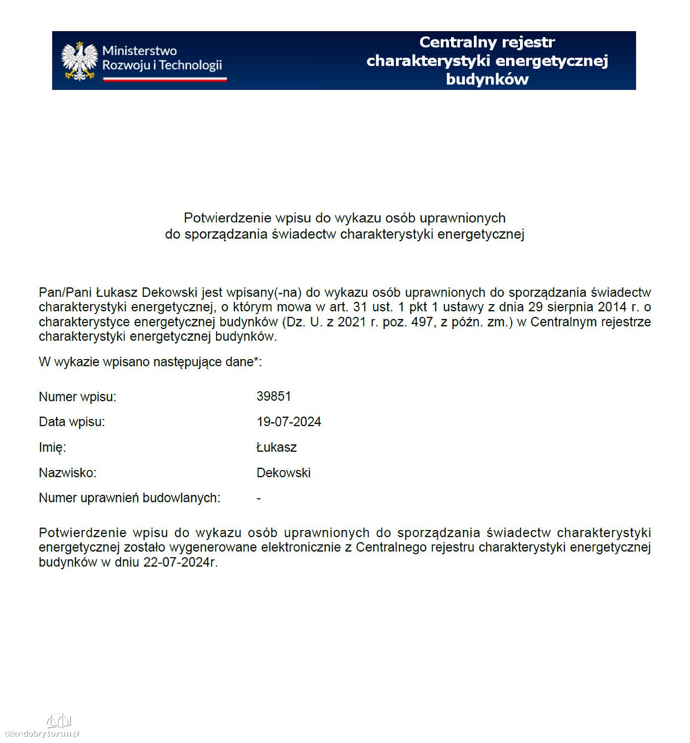 Łukasz Dekowski - nr uprawnień: 39851 Lokalny Audytor Energetyczny