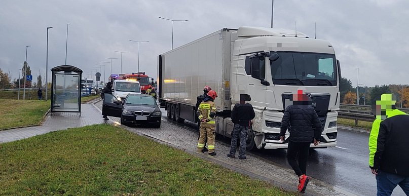 Chwile grozy przy moście im. gen. Elżbiety Zawcakiej w Toruniu. BMW wjechało pod ciężarówkę, a ta uderzyła jeszcze w kolejny samochód.