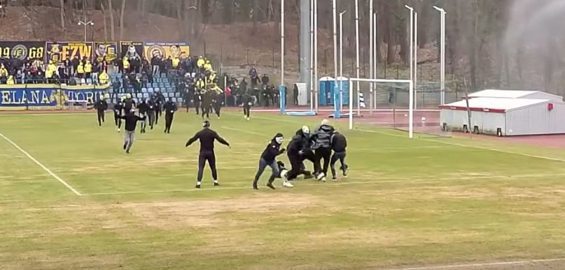 Burda na meczu Elany w Świnoujściu. Kibole wbiegli na murawę [WIDEO]