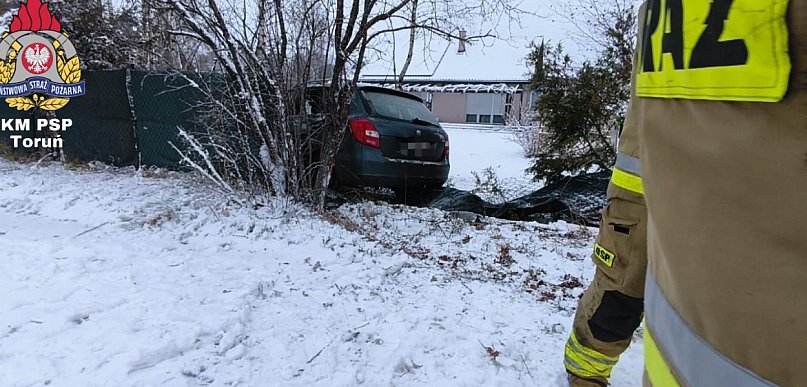 Śnieżny poranek zaskoczył kierowców w regionie. Jedna chwila na oblodzonej drodze wystarczyła, by samochód wypadł z jezdni. Na interwencję ruszyli strażacy.